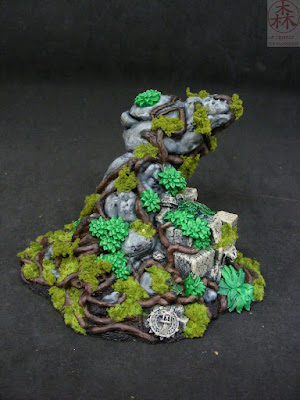 L'autre gros décors du set : un amas de rochers surplombant des vestiges d'une construction quelconque des hommes-lézards, le tout enserré par les racines d'une souche. Dommage que la photo bouffe un peu les différentes nuances de vert que j'avais données aux plantes ^^'