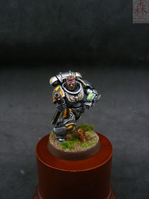 J'en termine avec l'une des pièces maitresses de mes unités : le champion/seigneur issu de la boite Blackstone Fortress. Outre le fait que ça fait une fig de plus peinte provenant de cette boite qui fut un véritable sans-faute du point de vue sculpture tant des héros que des antagonistes, même des péons de base, voilà une fig qui au final apporte beaucoup de cachet à mes troupes.